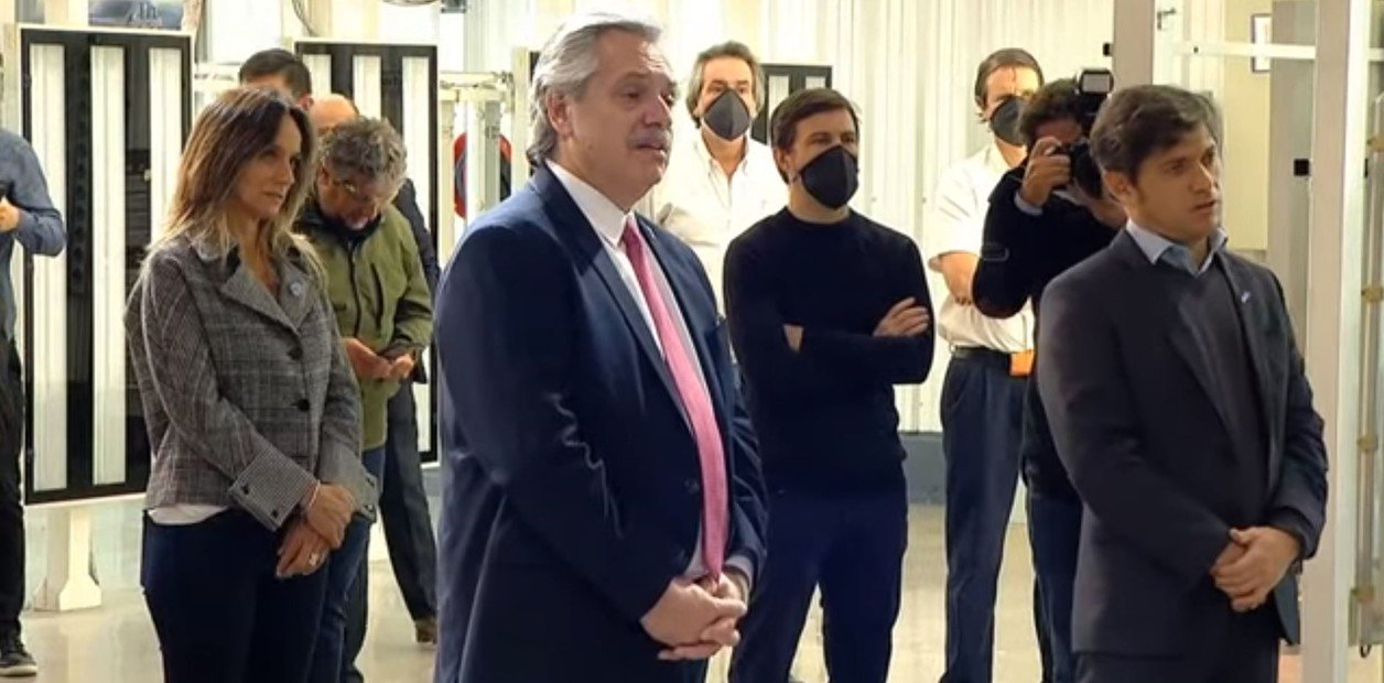Visita de Alberto Fernández y Axel Kicillof, al centro, a la planta de Volkswagen en General Pacheco.