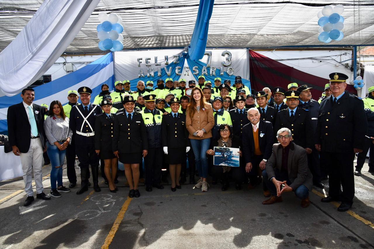 DANIEL SALMORAL.- La intendenta, Bettina Romero, acompañó la conmemoración del 73° aniversario de la creación de la Policía Municipal de Tránsito donde se reconoció a personal jerárquico y jubilados por sus años al servicio de la comunidad. En el acto el municipio entregó herramientas informáticas para educación vial.