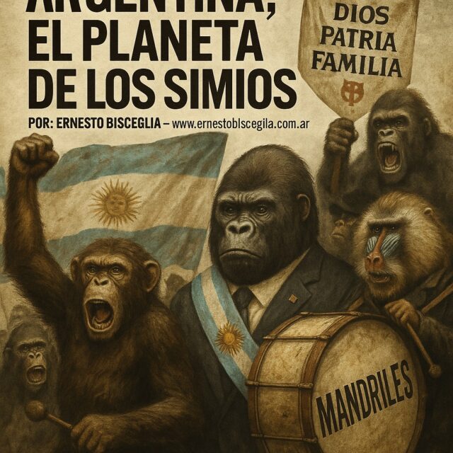 Esta Argentina es el mundo del revés. Darwin dijo que evolucionamos desde el simio, pero ahora resulta que la evolución ¡Es el simio! Porque el Mandril, como nuevo sujeto político argentino, alborota, grita, resiste, come polenta, bebe “Tetra” y baila cumbia, pero no entrega ni la Bandera ni el mate.