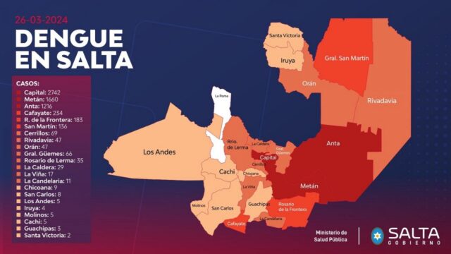Los municipios que se encuentran en brote -lo que significa que el virus del dengue está circulando de manera local- son Cafayate, Joaquín V. González, Orán, Salta, El Quebrachal, San José de Metán, El Galpón, Rivadavia Banda Sur, Tartagal, Rosario de la Frontera, Las Lajitas, Apolinario Saravia, Aguaray, General Mosconi, Cerrillos, General Güemes y Profesor Salvador Mazza.