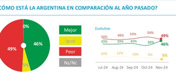 No obstante, el 49% aún considera que el país está peor que el año pasado y un 43% cree que estará peor todavía dentro de un año. Además, el 48% de los encuestados está convencido de que Argentina mejorará en los próximos doce meses.