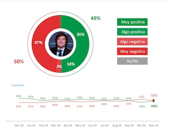 Después de dos meses de declive en su valoración pública, el presidente Javier Milei logró en noviembre una recomposición de su imagen y experimenta un aumento de tres puntos porcentuales en su imagen positiva, mientras que su rechazo disminuye en igual proporción, lo cual equilibra el reparto entre sus detractores y defensores, aunque todavía el balance le sigue dando negativo. El repunte se da especialmente entre los sectores de mayor nivel socioeconómico, donde la imagen del presidente alcanza calificaciones más positivas.