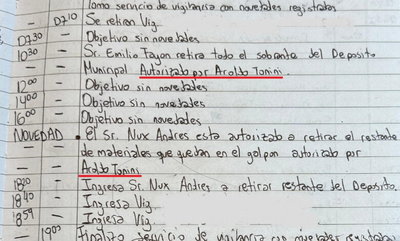 De acuerdo al registro de guardia del día viernes 8 de diciembre de 2023 (48 horas antes del cambio de gobierno), a las 10:30 de la mañana “el sr. Emilio Fayón retira todo el sobrante del depósito municipal autorizado por Aroldo Tonini”.