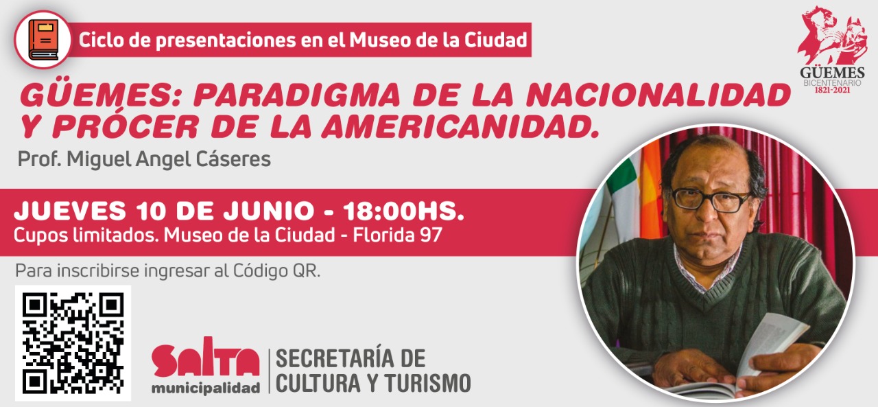 Este jueves 10, a las 18, a través del canal de youtube de la Secretaría de Cultura y, en forma presencial, en el Museo de la Ciudad “Casa de Hernández”, se realizará el octavo encuentro que tendrá como título: “Güemes: Paradigma de la Nacionalidad y Prócer de la Americanidad” y estará a cargo del profesor Miguel Ángel Cáseres.