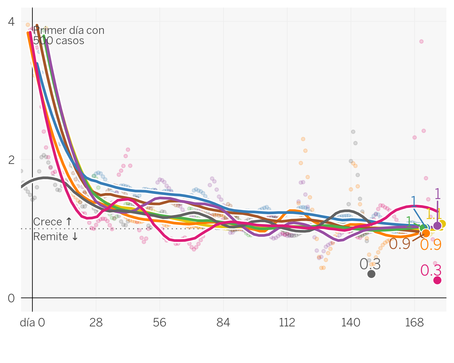 El número reproductivo (R) es otra métrica para seguir el ritmo del virus. Es posiblemente la mejor, especialmente cuando la epidemia crece exponencialmente. Este número estima a cuántas personas contagia, en media, cada infectado. En Europa se ha estimado que ronda un valor de 3 en ausencia de medidas especiales (según este trabajo o este otro). Las medidas de distancia social y confinamiento buscan reducir ese número. Si baja de 1 (es decir, si cada infectado contagia a menos de una persona) el brote entra remisión y acaba desapareciendo, al menos temporalmente.