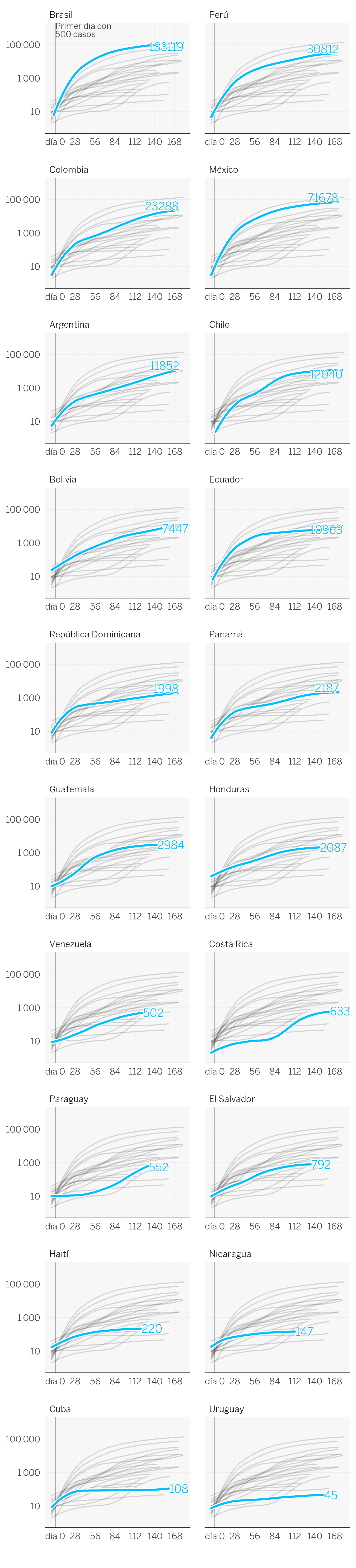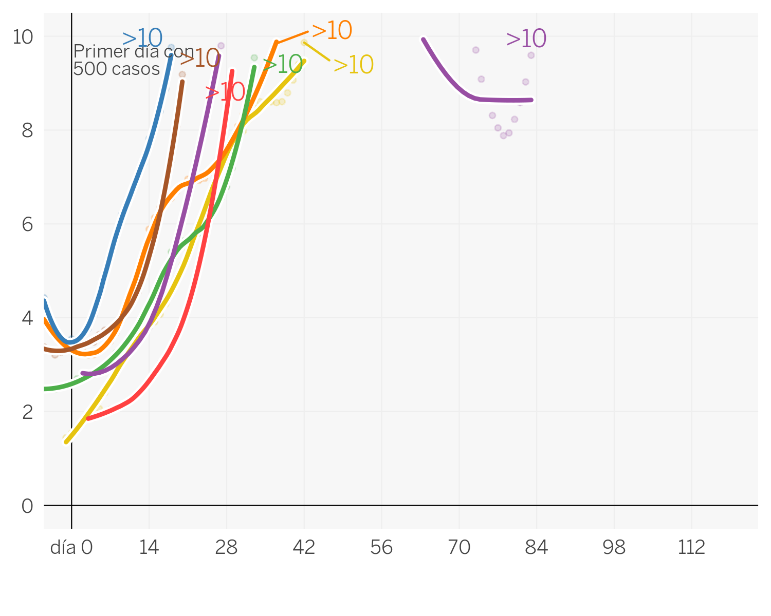 El gráfico muestra la evolución del número de muertos en varios países desde el inicio de cada brote (más abajo se muestran otra docena de países). La escala puede elegirse lineal o logarítmica (donde la distancia de 1 a 10 es igual que de 10 a 100), pero esta captura mejor la naturaleza de una epidemia: se multiplica.LogarítmicaLineal