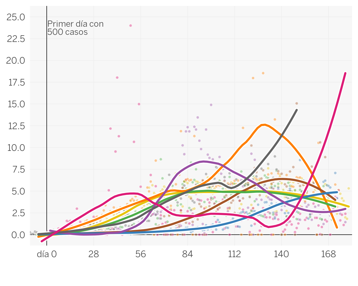 👉 ¿Por qué cifras de fallecidos? Esas cifras tienen el inconveniente de que llegan con retraso, dado que las muertes tardan en producirse dos o tres semanas desde el contagio. Son una métrica que, en cierto sentido, nos hablan del pasado de la epidemia. Pero su ventaja es que, aunque no sean datos perfectos, son un registro más preciso que el de casos confirmados.
