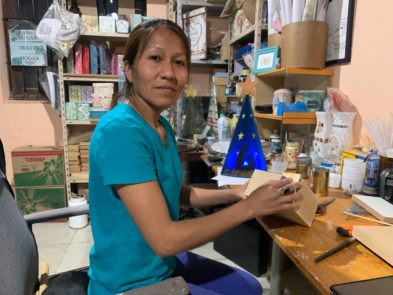 Una de las emprendedoras que recibió el microcrédito fue Rocío Gutiérrez, de “Deco-Ro” Artesanías, quien contó que comenzó con su trabajo durante la pandemia. “Debía apoyar a mi familia económicamente. Me animé a hacer mi propia elaboración de fibrofácil, pino y machimbre”.