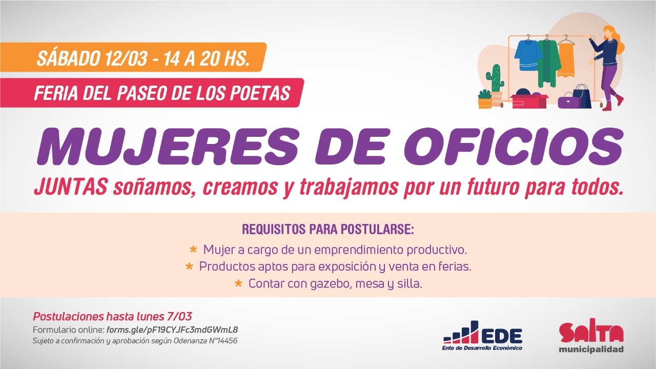estará disponible en las redes del Ente de Desarrollo Económico hasta el lunes 7 de marzo. Luego de esa fecha, personal de la Municipalidad se comunicará con las postulantes para confirmar la información y en caso de aprobación, según Ordenanza N°14456, serán incluidas en la jornada de la feria del sábado 12.