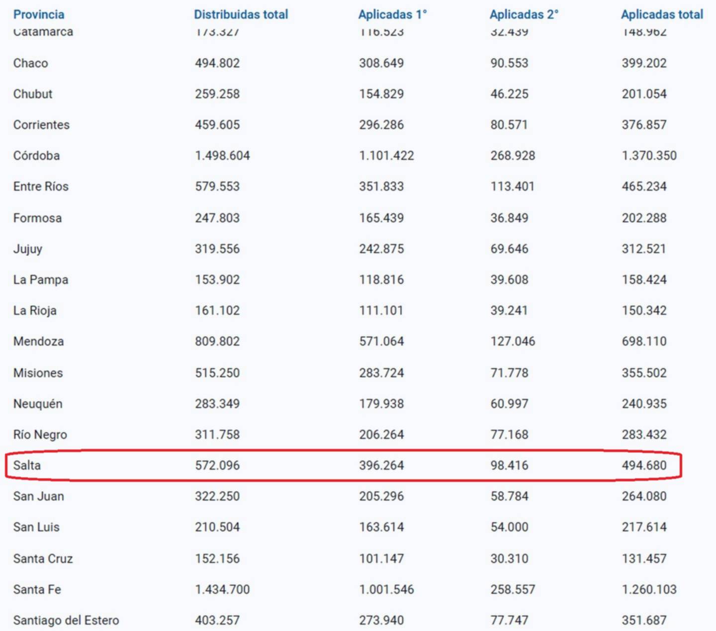 Por otra parte, y según se desprende del Monitor Público de Vacunación, Salta aplicó a este domingo 396.564 primeras dosis de la vacuna, y 98.416 del segundo componente (un total de 494.680 de aplicaciones).