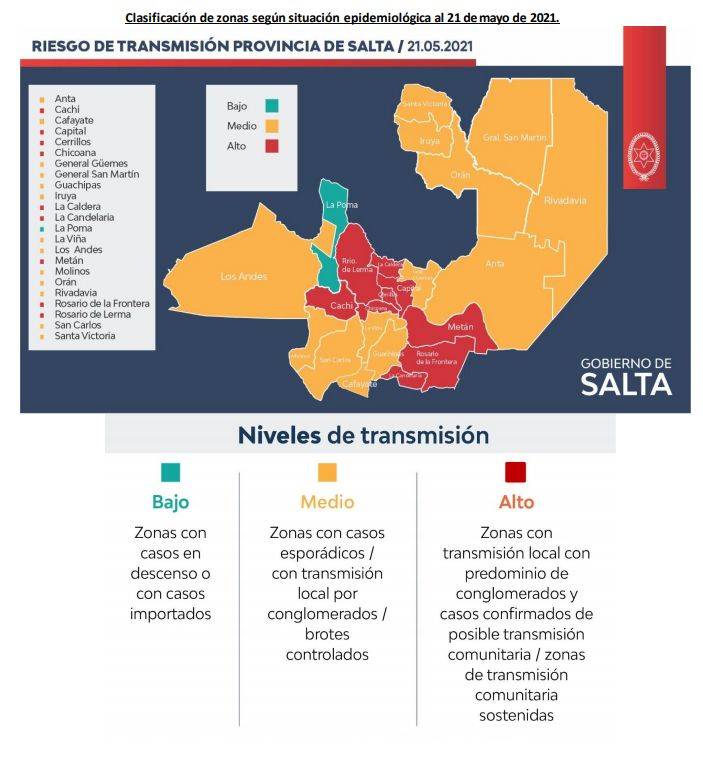 Sin embargo, según lo publicado en el sitio web de la Sala de Situación de la Dirección General de Coordinación Epidemiológica de la Provincia, http://saladesituacion.salta.gov.ar/web/covid/, en el mapa actualizado figuran nueve departamentos pintados de rojo, que son los considerados como de alto riesgo en relación con el coronavirus: Cachi, Capital, Cerrillos, Chicoana, La Caldera, La Candelaria, Metán, Rosario de la Frontera, Rosario de Lerma.