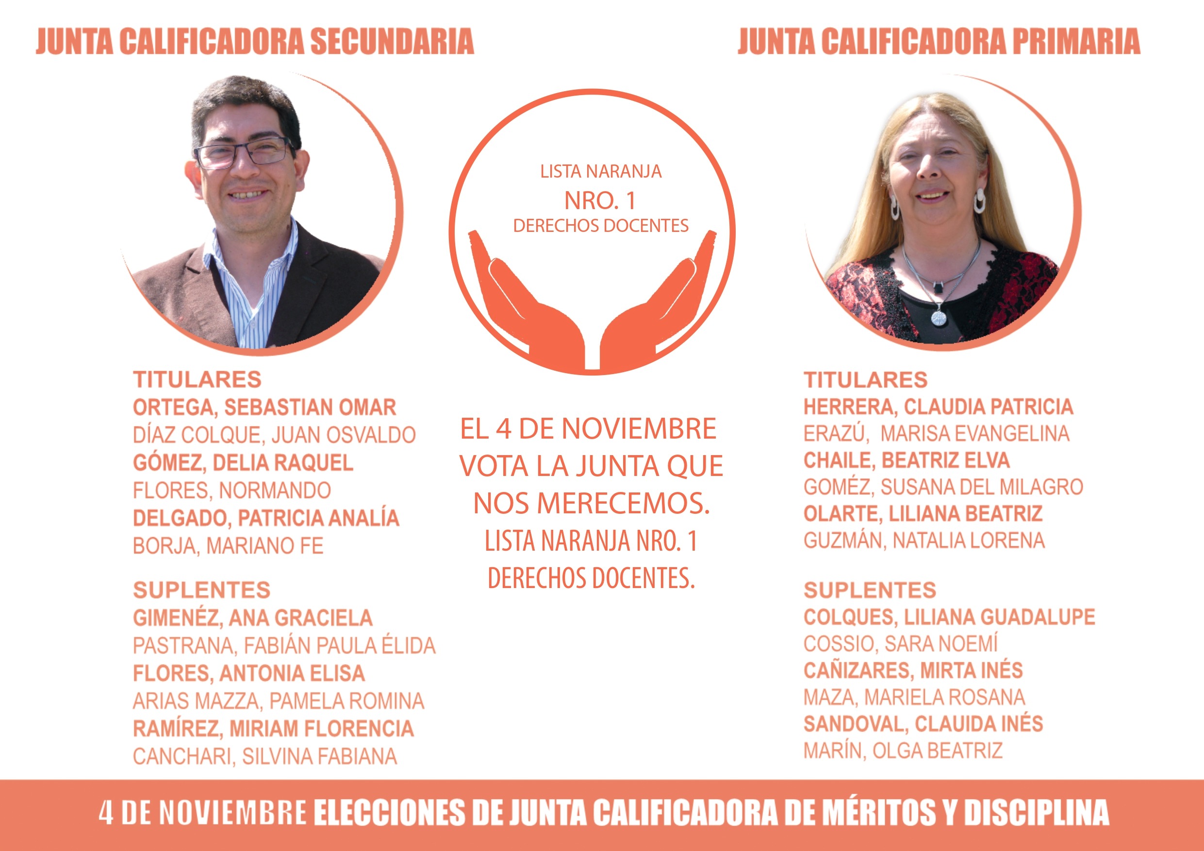 La Lista está conformada por Candidatos para el Nivel Primario, Titulares : Claudia Patricia Herrera, Marisa Evangelina Erazu, Beatríz Elva Chaile, Susana del Milagro Gómez, Liliana Beatríz Olarte, y Natalia Lorena Guzmán. Suplentes :Liliana Guadalupe Colque, Sara Noemí Cossio, Mirta Inés Cañizarez, Mariela Rosana Maza, Claudia Inés Sandoval, y Olga Beatríz Marín.